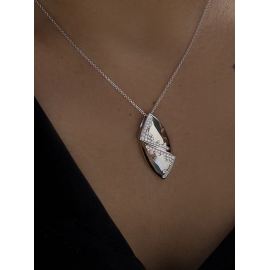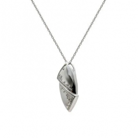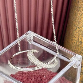 Gargantilla fabricada en plata de ley y un colgante con diseño curvado que destaca por una franja diagonal de circonitas blancas en pavé. La cadena mide 42cm + 3cm de extensión y el colgante 3.3cm. Cierre de mosquetón.