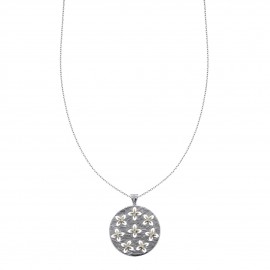 Gargantilla fabricada en plata de ley con un colgante en forma de flor embellecido con brillantes circonitas que aportan un toque de elegancia y luminosidad. La cadena mide 42cm de largo + 5cm de extensión y el colgante 2.5cm. Cierre de mosquetón.