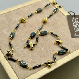 Gargantilla en plata de ley con baño de oro y perlitas de rio en la parte central. Mide 40cm de largo más 5cm de cadena alargadora