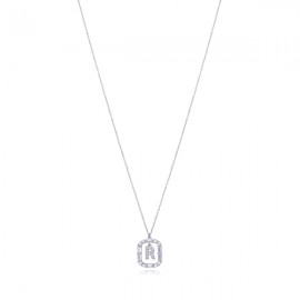 Collar con la letra R de plata y circonitas blancas de 42 cm de largo. Luce una joya personalizada y realizada con los mejores materiales, con extremo mimo y cuidado. Un colgante que te acompañe siempre, con el que llenar de buenos momentos la vida. Brilla como solo tú sabes