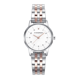 reloj de pulsera para niña comunión colección Sweet. Reloj Viceroy con caja de acero, diámetro de la caja 30 milímetros y brazalete de acero bicolor dorado rosa con cierre desplegable con doble pulsador de seguridad Viceroy. Esfera en blanco con circonita en las 12, números arábigos en negro, agujas e índices en rosa. Resistente al agua. En estuche, reloj Viceroy y pendientes pingüinos en plata con cierre tuerca presión de seguridad Viceroy. Estuche y garantía Viceroy