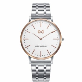 Reloj de Hombre Mark Maddox de la colección Greenwich con dos agujas, caja y brazalete en acero con bisel de caja bañado en rosa, esfera de color plata e índices en rosa combinado con el mismo color del bisel y las agujas.
