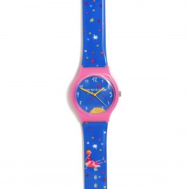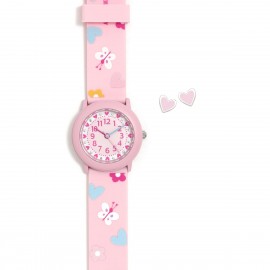 Reloj rosa con estampado de corazones y mariposas, caja aloy pintada, dial con piedras y correa de silicona.