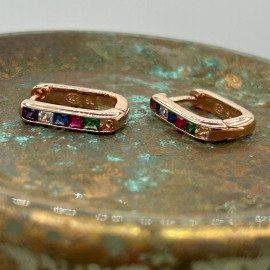 Aros fabricados en plata de ley con baño de oro rosa y circonitas de varios colores. Cierre de click. Cómodos y perfectos para combinar con cualquier look.