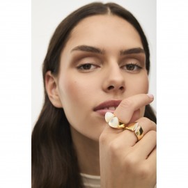 Sortija fabricada en plata de ley con baño de oro y madreperla. Se adapta a varios números gracias a su diseño abierto. Pertenece a la colección M.O.P. de Durán Exquse.
