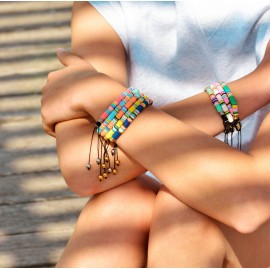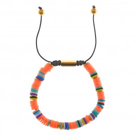 ¡Llega el calor y apetece un toque de color! Pulsera bahía fabricada en hilo, con discos de resina combinados en diferentes colores pero la gran mayoría en naranja y terminal en plata de ley con baño de oro. Aporta un toque veraniego a tus looks.