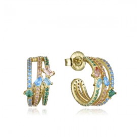Pendientes de aro de plata de ley con baño de oro y circonitas de colores, una joya que no pasará desapercibida en ningún momento. El conjunto rezuma una belleza con un toque exótico que habla por sí sola.