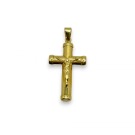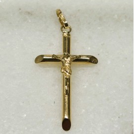 Cruz en oro de 18k, caña redonda y puntas haciendo chanfle. Mide 2.5cm de largo más reasa. Lleva Cristo en relieve