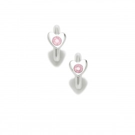 Aros fabricados en plata de ley con baño de rodio en forma de corazón con una brillante circonita en color rosa en el centro.
