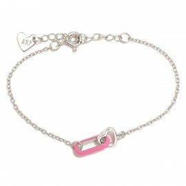 Pulsera fabricada en plata de ley con baño de rodio en forma de corazón y esmalte color rosa. Tiene cadena alargadora. Cierre de mosquetón.