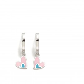 Aros fabricados en plata de ley con baño de rodio y colgante de corazón con esmalte en color rosa y azul.
