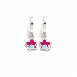 Aros fabricados en plata de ley con baño de rodio y colgante en forma de flor con esmalte en color fucsia y azul.