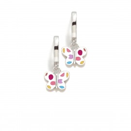 Aros fabricados en plata de ley con baño de rodio y colgante de mariposa con topos en esmalte multicolor.