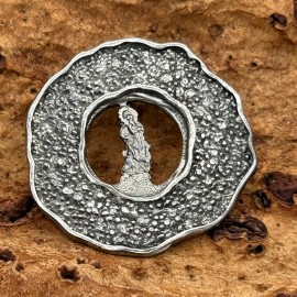 Medalla en plata de ley envejecida. Virgen del Saliente 25mm de diámetro. Reasa interior.