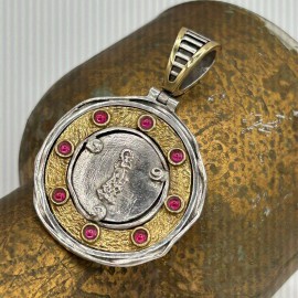 Colgante en plata de ley y centro de broce. detalle en bronce oxidado y rubíes. 36mm de diámetro.