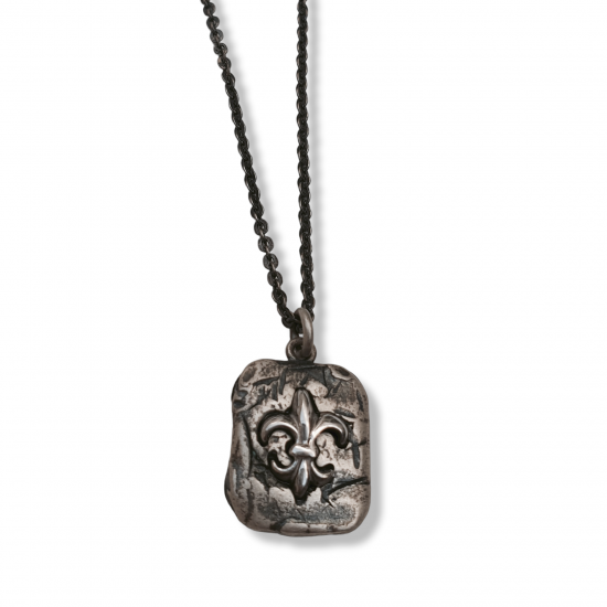 Colgante en plata envejecida, diseño de flor de lis. Cadena de 60cm de largo