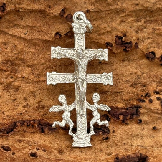Colgante Cruz de Caravaca en plata de ley. Mide 4cm de largo.