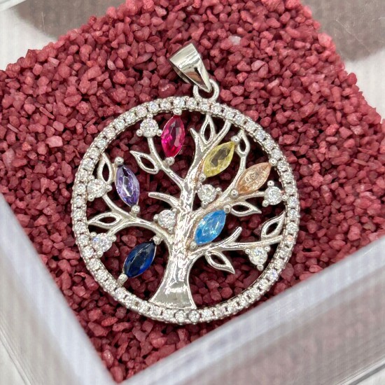 Colgante Árbol de la Vida en plata y circonitas de colores. Mide 2.5 cm de diámetro