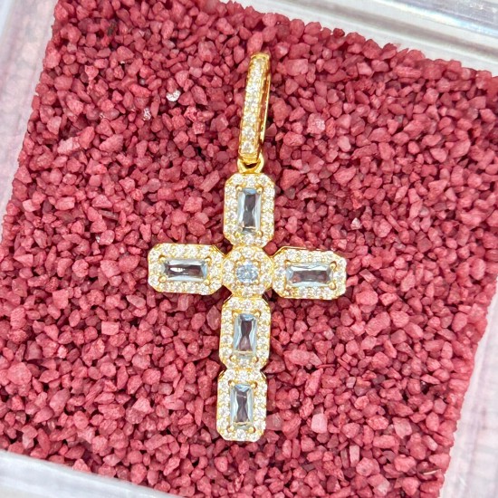 Cruz en plata de ley con baño de oro y piedras color aguamarinas con cercos de circonitas