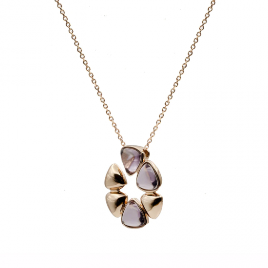 Sumérgete en la elegancia con nuestro encantador collar en forma floral, elaborado en plata bañada en rosa y acentuado con detalles morados
