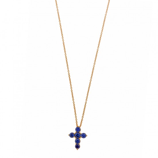 Gargantilla fabricada en plata de ley con baño de oro y un colgante en forma de cruz con circonitas en color zafiro. La cadena mide 47cm de largo. La cruz mide 1.7cm de largo. Cierre de mosquetón.