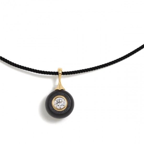 Colgante de madera de ébano, plata y circonita. Con cordón de seda y cierre corredero.