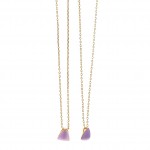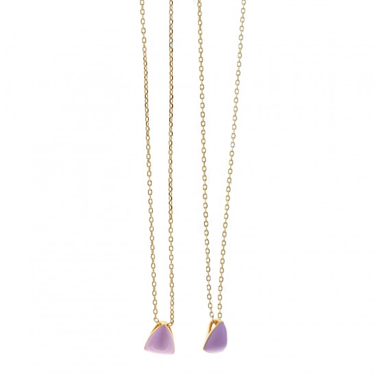 Gargantilla fabricada en plata de ley con baño de oro y un colgante en forma de triángulo de esmalte lila. La cadena mide de largo 40cm más 4cm de extensión. Cierre de mosquetón.
