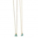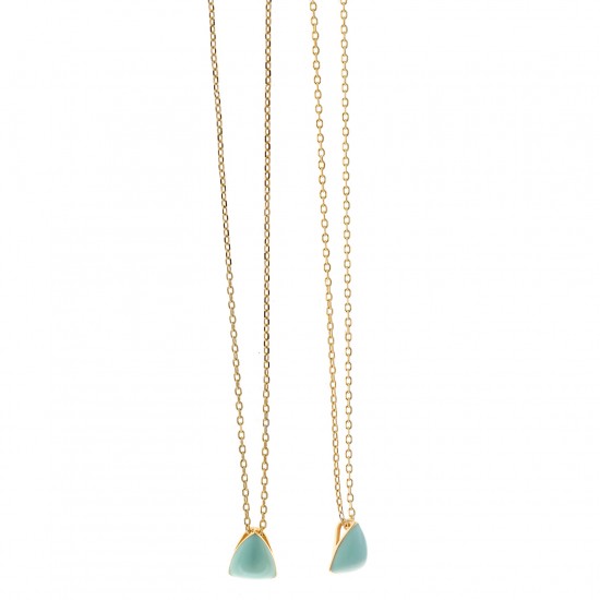 Gargantilla fabricada en plata de ley con baño de oro formada por un colgante con forma de triángulo en color verde menta. La cadena mide 40cm más 4cm de extensión. Cierre de mosquetón.