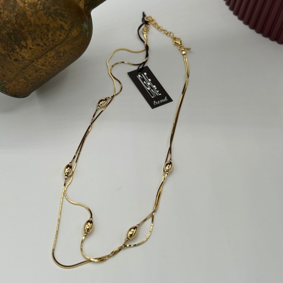 Gargantilla doble fabricada en plata de ley con baño de oro. Una de las cadenas lisa y la otra con 5 bolitas de plata doradas. Mide 42.5cm de largo + 4.7cm extensión. Cierre de mosquetón. Ideal para combinar con cualquier look.