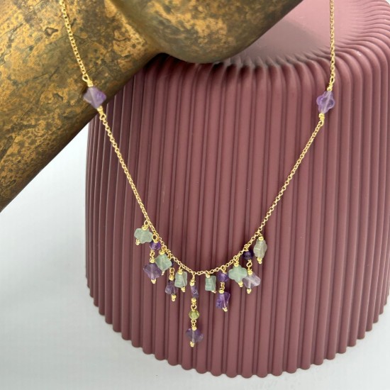 Gargantilla fabricada en plata de ley con baño de oro y piedras naturales. Mide 40cm + 5cm de extensión. Cierre de reasa.