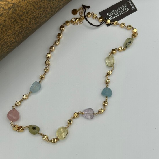 Gargantilla fabricada en plata de ley con baño de oro y piedras naturales de diferente colores. Mide 38.5cm de largo + 5cm de extensión. Cierre de mosquetón.