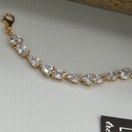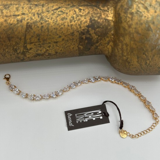 Pulsera fabricada en plata de ley con baño de oro formada por brillantes circonitas blancas. Ideal para completar tus looks más especiales. Mide 16cm de largo + 4cm de extensión. Cierre de mosquetón.