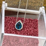 Gargantilla fabricada en plata de ley con un colgante en forma de lágrima formado por una piedra azul color zafiro sujeta por tres garras de plata y rodeada por pequeñas y brillantes circonitas en color blanco. Mide 40cm + 5cm de extensión. Cierre de mosquetón.