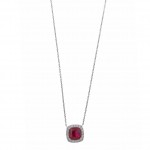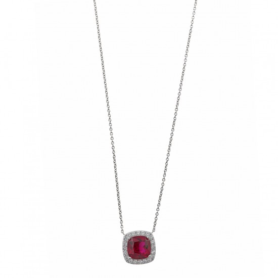 Gargantilla fabricada en plata de ley con baño de rodio formada por una piedra rubí cuadrada rodeada por pequeñas y brillantes circonitas blancas. La cadena mide 40cm + 4cm de extensión. El colgante mide 1cm. Cierre de mosquetón.