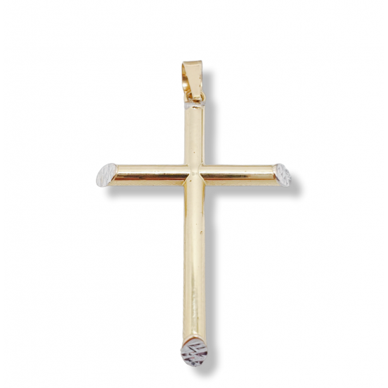 Cruz en oro de 18k con puntas en chanfle oro blanco. 35mm de largo.