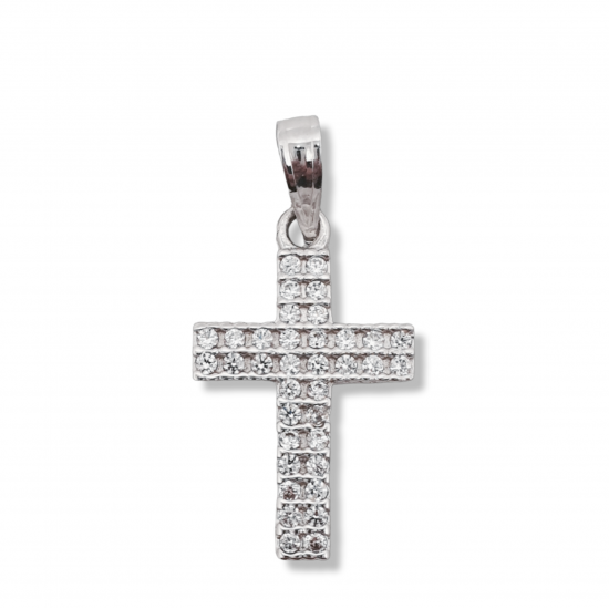 Cruz en oro blanco con pavé de circonitas. 24mm de largo