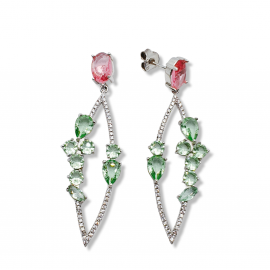 Pendientes largos en plata de ley con circonitas y cuarzo adamantino verde y rosa. Cierre de presión. 50mm de largo