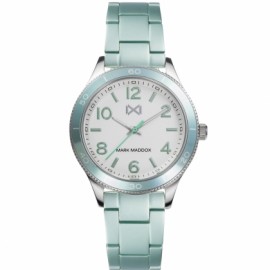 Reloj de Mujer Mark Maddox de la colección Shibuya con tres agujas con la caja de acero, el bisel y el segundero en color turquesa claro con la esfera plateada y el brazalete de aluminio turquesa claro.