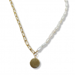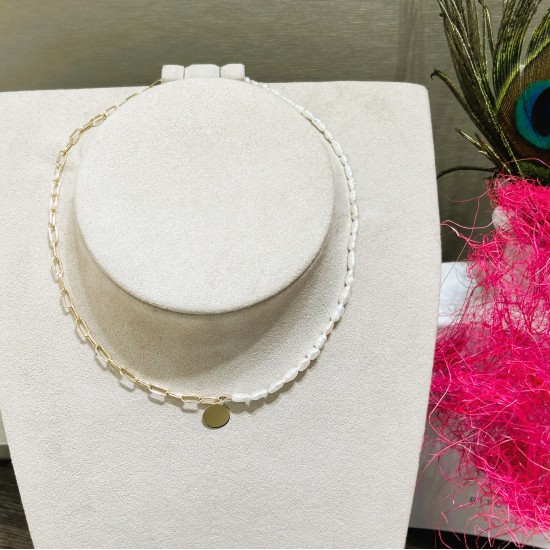 Gargantilla en oro de ley y perlas de río. con colgante central disco de 1cm de diámetro. Con posibilidad de grabar. Largo 40cm