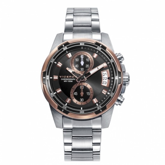 Reloj de Hombre Viceroy de la colección Heat, con cronógrafo, caja y brazalete en acero, esfera negra con la subesfera en color rosa, bisel de caja en negro y en rosa.