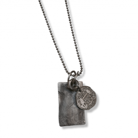 Cadena de 60cm de largo con colgante de chapa y moneda en acero envejecido.