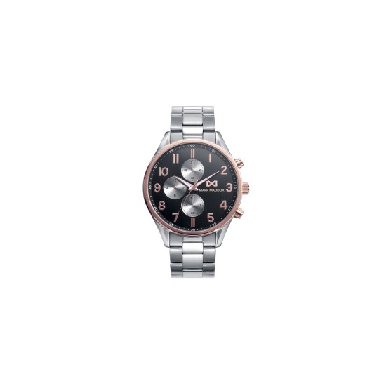 Reloj de Hombre Mark Maddox de la colección Village multifunción con la caja de acero y el bisel y las coronas bañados en rosa. Esfera negra con los contadores localizados a las 6, 9 y 12 en plateado, índices y números arábicos en rosa y brazalete en mate y brillo.