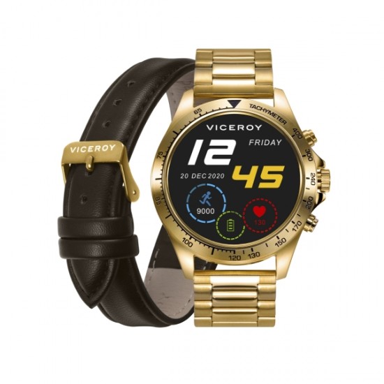 Smartwatch Viceroy SmartPro con caja y brazalete de acero con baño dorado , pantalla táctil, con cuatro esferas propias para elegir. Los SmartPro son compatibles con teléfonos con un sistema operativo Android 5 o superior o iOS 10 o superior. Las funciones admitidas pueden variar entre plataformas y países. Con tu SmartPro podrás recibir tus llamadas , notificaciones y mensajes, medir tus pulsaciones y oxígeno en sangre, cuentapasos, distancia realizada, gestión de deportes, cronógrafo, controlar tu calidad de sueño, controlar tu música, definir alarmas, disparar la cámara de tu móvil de forma remota, localizar tu teléfono.
