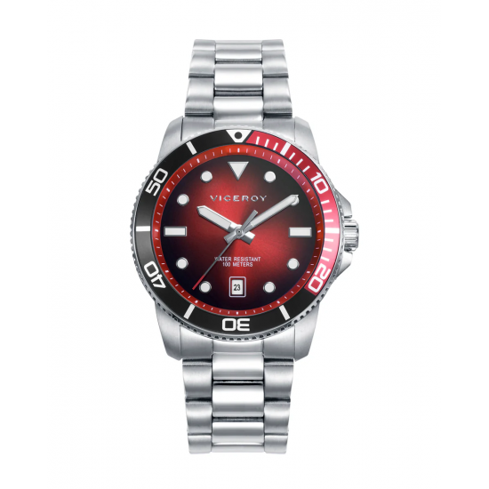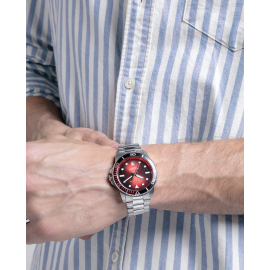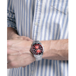 Un reloj para hombre con caja acero y bisel de aluminio bicolor en negro y rojo. Su esfera negra y roja con índices y agujas plateadas ya es un clásico moderno.