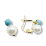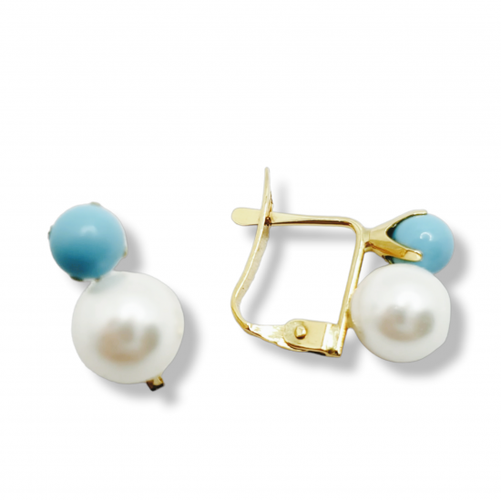 Pendientes en oro de ley. tu y yo perla y turquesa. Cierre catalán. 10mm de largo.