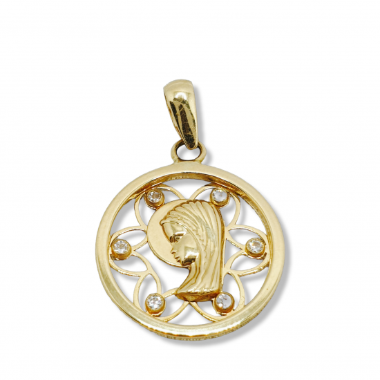 Medalla Virgen Niña calada en oro de 18k y circonitas. 12mm de diámetro.