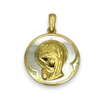 Medalla en oro de 18k con imagen de la VIRGEN NIÑA en oro sobre fondo de nácar. 17mm de diámetro.