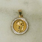 Medalla en oro de 18k con la imagen de la Virgen Niña. Cerco de circonitas incrustadas. Mide 1cm de diámetro