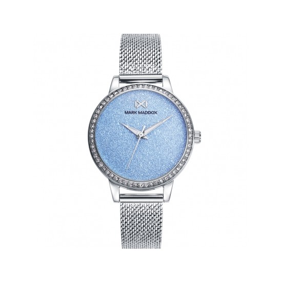 Reloj de mujer Mark Maddox de la colección TOOTING con esfera de glitter azul, bisel con circonitas y malla de acero efecto diamantado con cierre deslizante que facilita su ajuste.