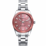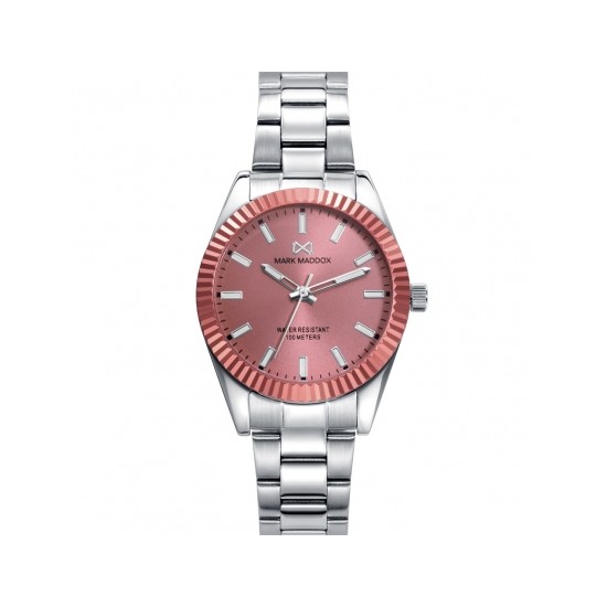 Reloj de mujer Mark Maddox de la colección SHIBUYA con bisel de aluminio salmón, esfera del mismo color y brazalete de acero con cierre desplegable mediante pulsadores. Sumergible 100 metros.